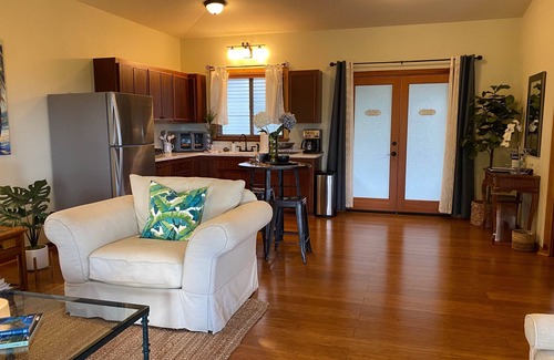 Located on the Big Island of Hawaii, this detached studio guest house is fully furnished, very private, with vaulted ceilings on a beautifully landscaped 3 acre privately enclosed property. Property has a gated entrance with private gate code, grounds security system, over 80 fruit trees and 2 Koi fish ponds. Studio sleeps up to 5 (one queen-size bed, one full-size futon sofa bed, and a single blow-up mattress), has 1 bathroom with shower and kitchen with refrigerator, convection oven, stovetop burner, coffee maker, blender, and all necessary kitchen cooking/eating utensils. Rental also includes a dual washer/dryer unit, clothes drying rack, armoire for hanging clothes, outdoor BBQ, outdoor patio seating and eating table for 4, fiber optic high-speed internet, smart TV, yoga mat, umbrellas and other essentials. Outdoor storage shed has 4 beach chairs, 3 beach umbrella, coolers, boogie board, 4 adult snorkel sets/2 child snorkel sets, volleyball, and beach toys that can be used by guests of the rental. Studio has a private entrance, parking spot for 2 vehicles, and 180 degree views of the 3 acre property and Koi fish pond from the patio. Pond area has 4 chairs, bistro table for 2 with umbrella, and 2 lounge chairs with umbrella for guests to use. This guest house is conveniently located 15 minutes south of Hilo and 10 minutes between the small towns of Keaau and Pahoa. There is also a grocery store and farmer’s market within 5 minutes of the rental. This is the perfect central location for all activities on the east side of the Big Island of Hawaii, including sites such as Volcanoes National Park, magnificent waterfalls, downtown Hilo, and the famous black sand and green sand beaches.